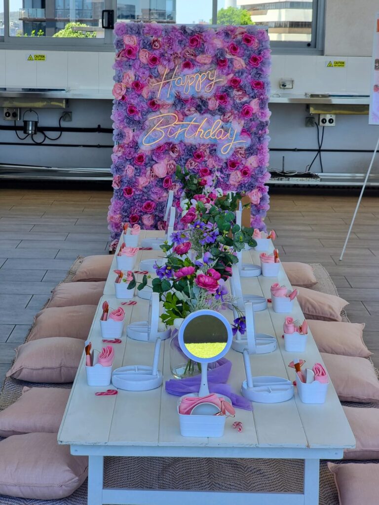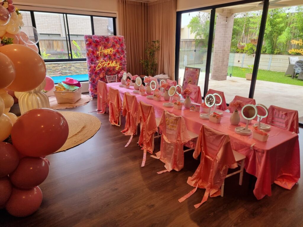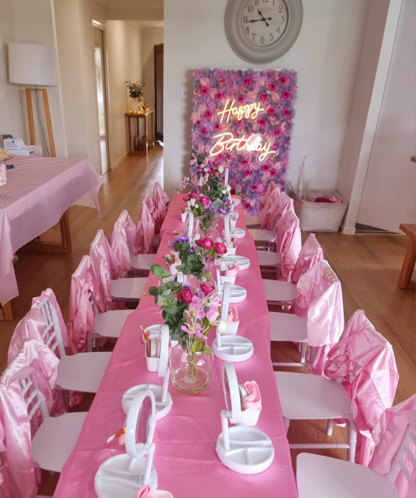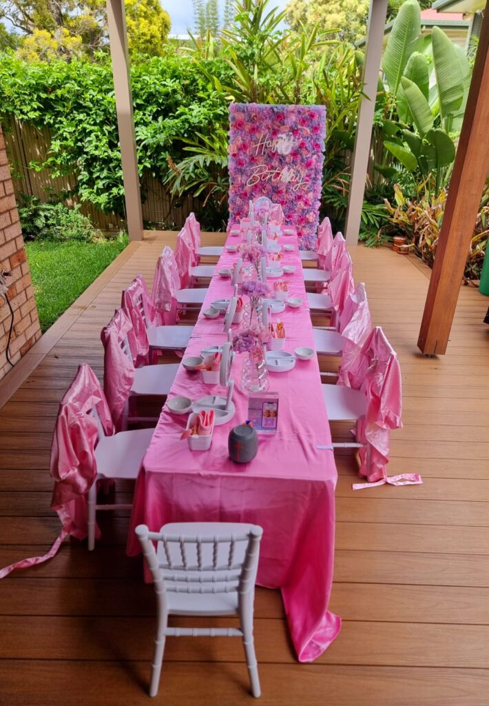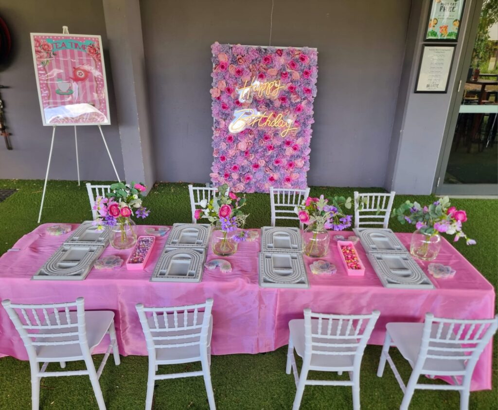 • Venue decoration including flower backdrop, Tiffany chairs, tables, tablecloths, mirrors, flower centrepieces, and themed table décor
